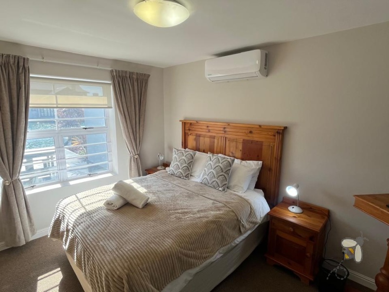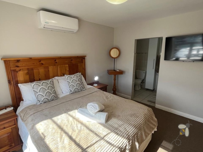 The home offers two comfortable bedrooms. The first bedroom is carpeted and fitted with built-in cupboards. The main bedroom, which has its own en-suite bathroom, is also carpeted and includes air conditioning, built-in cupboards, and a TV. The bathrooms are well-appointed, with one offering a bath, basin, and toilet, and the en-suite featuring a shower, basin, and toilet.