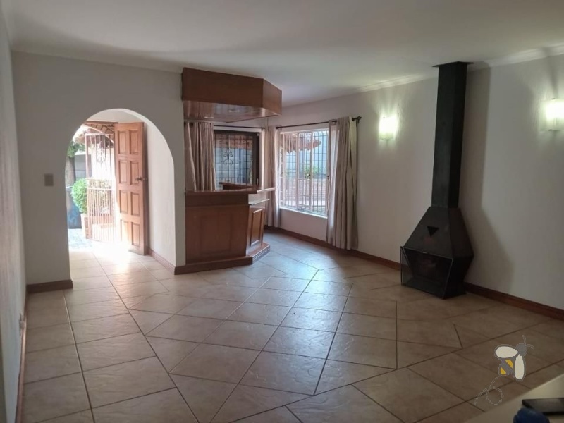 This spacious and secure home features three generously sized bedrooms, with the main bedroom offering a private ensuite bathroom and his-and-hers built-in cupboards for ultimate convenience. The open-plan layout seamlessly connects the lounge, bar, and kitchen into one expansive living area—perfect for entertaining or relaxing in comfort. A separate reception lounge adds extra living space, while a cozy fireplace brings warmth and charm to the home. The functional scullery helps keep the kitchen tidy and efficient.