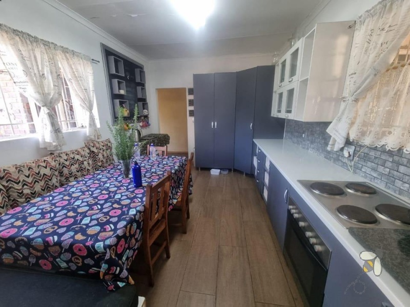 The fitted kitchen with a separate scullery flows seamlessly into the open-plan lounge and dining area, creating a warm family atmosphere. Sliding doors open to a charming garden where you’ll find a sparkling pool, covered lapa, and built-in braai — ideal for entertaining guests or enjoying family weekends.
