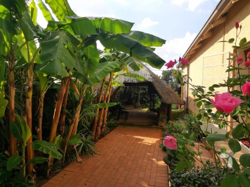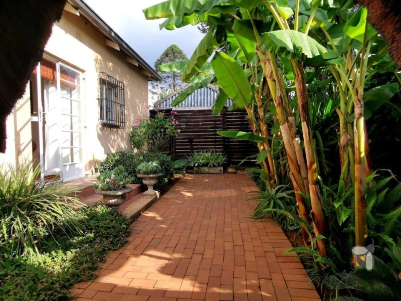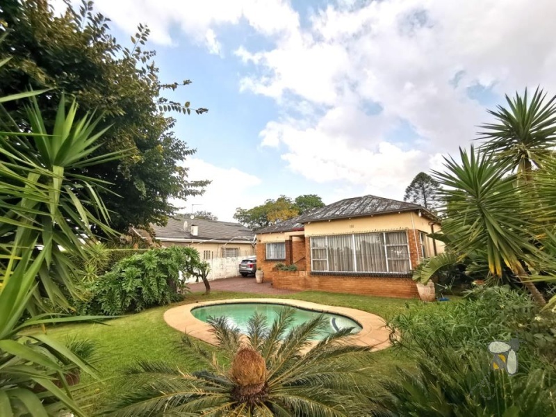 Buite wag ’n rustige tuin en ’n glinsterende swembad wat die perfekte atmosfeer skep vir ontspanning en vermaak.