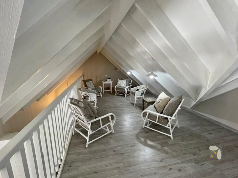 Living Areas: Open-plan kitchen, dining, and living room with high ceilings and exposed trusses, blending character with comfort
