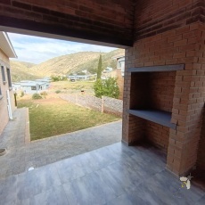 The heart of the home is an inviting open-plan layout, where the lounge, dining area, and kitchen merge into one bright, airy space. High ceilings and tall walls enhance the sense of volume, while a built-in indoor braai/fireplace ensures year-round comfort and perfect gatherings.