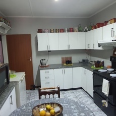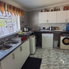 Die sitkamer en eetkamer is oop-plan, met skuifdeure wat direk na die pragtige agterplaas lei. Die kombuis is goed toegerus met oorgenoeg kasruimte en ‘n hoekspenskas, aangevul deur ‘n deurstap, groot opwaskamer en wasgoedarea.