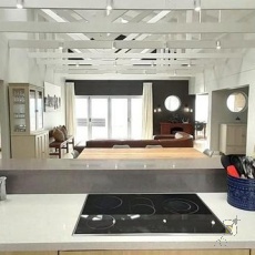 Die pragtig vervaardigde boonste verdieping is die hart van hierdie huis, met ‘n oop-plan sitkamer en eetarea wat naatloos oorvloei in ‘n binnebraai area. Hier kan u die beste panoramiese uitsigte geniet wat Stilbaai te bied het. Die pasgemaakte kombuis, toegerus met hoë-gehalte toebehore en afwerkings, sluit ‘n aparte waskamer area in en maak oop na die agterkant van die eiendom met nog ‘n patio. Hierdie ruimte is perfek om rustige middae in kalmte te geniet. Die binnehof van die eiendom grens aan ‘n welige groengordel.
