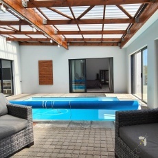 Leefareas: Ruim oopplan sit- en eetareas met ingeboude braai en voubare deure wat oopskuif na ‘n warm swemkamer; buite-boma geskik vir dierkyk en braai.