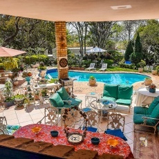 Lovely patio overlooking landscaped gardens and sparkling pool area
